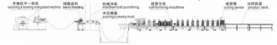 该线具备开卷、校平、伺服送料、冲孔、压型、立边,辊压成型、切断等自动柔性流水线生产功能,即可生产C型材,又可生产M型材,压型翻边高度可达到17.5mm,厚度范围大:从1.5mm到3.0mm,即完美的解决了C型材底部驱动面积小的动力难题,又解决了预冲变形的辊弯工艺难题,还完美地实现了冲孔、辊压、剪切有机结合的一剪多用的功能 。