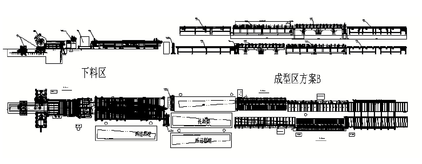 2 该生产线能生产多种板宽、截面、长度的顶板,更换规格时需调整纵横剪角度、冲缺口模具和切端头挡料仅需调整相对位置,真空吸盘和翻边压料块需根据板型不同做相应更换,集中冲孔则需要根据板型的不同,调整个别冲孔机,无需全部调整。通过以上操作,便可实现多种板型的生产。